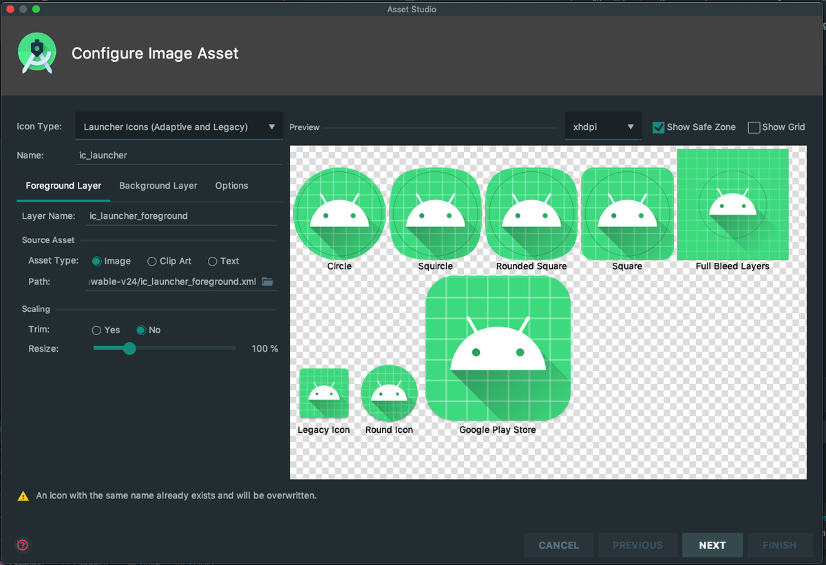 src/main/res/mipmap-xxxhdpiThe better way to do this is to right-click on the res folder and navigate to new>imageAsset. In this window, you can select a high-resolution app icon, and Android Studio will generate the above assets for you automagically!